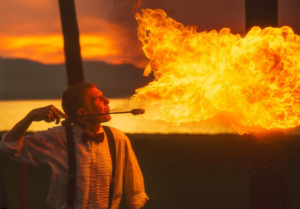 Shows include fire breathing, fire juggling, partner acrobat fire routines, choreographed pieces, and fire dancing with various props (torches, hoop, fans, poi, and staff).